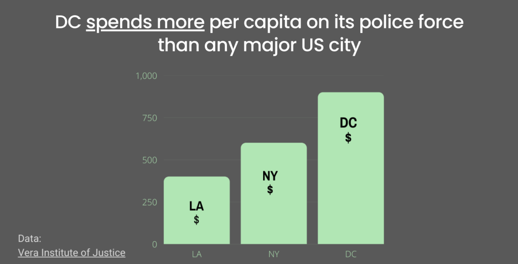 > DC spends more per capita on its police than any other major US city (this does not include additional spending on the many federal law enforcement agencies located in DC).